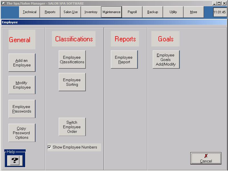 Modify an EmployeeClick More until you see Maintenance. Click Maintenance followed by Employee. Click Modify/Delete Employee. Choose an employee with an asterisk in front of it. Pay TypeDetermine how you are going to pay the employee. If the employee is paid by multiple pay methods, Hourly and Commission, make sure to choose the option showing both pay methods. Price LevelEach employee is assigned a Price Level. The first eight levels are used to determine the standard price for each service. The 9th Price Level is used for employees that should not appear on the appointment book. A warning is displayed each time to remind you of the function of the 9th Price Level. Regular Pay/Overtime PayThe Regular Pay is the hourly pay for the employee. The Overtime Pay, by federal standards is 1½ times the regular pay. If you pay the same amount for regular and overtime, enter the same hourly pay in each blank. Check with your accountant on the legality of this practice. SalaryThe Salary is the amount to be paid during a single pay period. If your pay period is two weeks, the amount typed should be the total salary for the two week period. Payroll StatusThe Payroll Status is how employees are set to, ie: On Payroll, Sick Leave, and Off Payroll. To terminate an employee they should be set to Off Payroll. The employee name will still show in the Employee Maintenance screen, but the name will be proceeded with an asterisks (*). The removed employee will not show on any other screen. ClassificationThe Classification is used to help the selection of employees in the appointment book, time card, and other parts of the program. By classifying your employees, all nail techs can be chosen by clicking on the button Nails. Common classifications include Hair, Nails, Massage, Skin and any other department in your business. Note: An employee can only be classified under one classification. If the employee performs services in two departments you must choose the classification that the employee performs most. Click Save to assign a password for the employee. Password AccessPassword Access is assigned for an employee that you want to access the computer. If you don't want an employee to use the computer, don't enter a password. A simple way to assign passwords is to use the last four digits of the employees social security number.