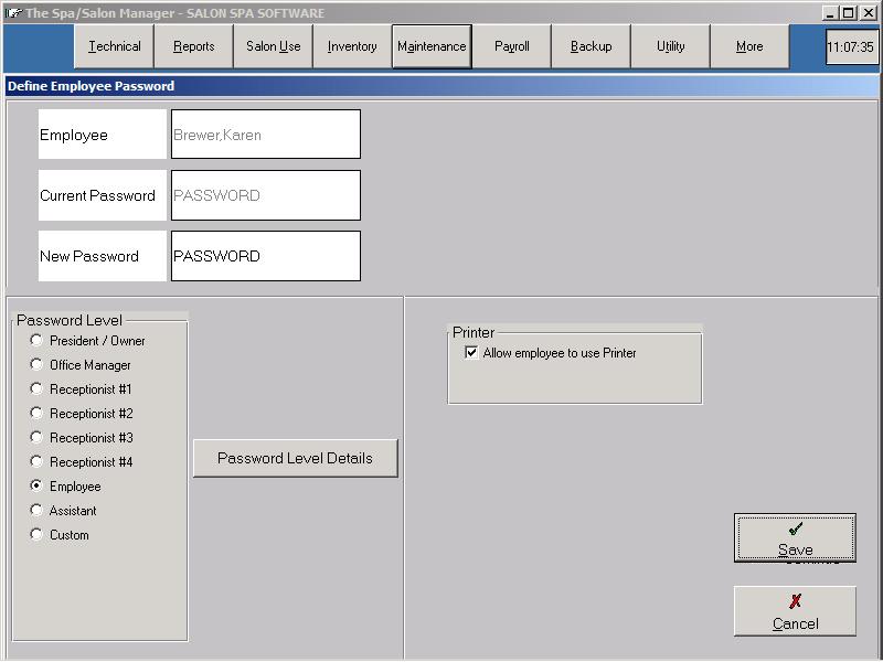 Password LevelThe harder decision is to determine which Password Level to place your new employee. A rule of thumb is to give an employee the lowest access that allows them to complete the job you want them to complete. To understand what each level allows the employee to perform, click the Password Level followed by clicking the Password Level Details. A heading above each box of choices shows the options for Appointment, Sales Options, Receptionist Reports, Management Reports along with Performance Reports. All aspects of the program are shown with a checkmark in front of what the employee would be allowed to perform if that Password Level was chosen. PrinterThe Printer option determines whether the employee can print the reports that you have given them access to via the Password Level. Remember, if you did not give them access to the Mailing Menu, giving them print rights will not give them access printing out a list of clients. Net Payroll Manager Setup - (Optional)Note: You must have purchased the Payroll module to use this feature. Setting an employee up for Net Payroll Calculation is accomplished from the Maintenance Menu followed by the Payroll/Accounting Setup option. Employee Payroll InformationThe Employee Payroll Information records the employee address information which is printed on the payroll check. The system records the employees social security number along with marital status. It is important to enter the correct number of exceptions along with the marital status, since both affect the calculations of taxes. If you do NOT withhold any taxes for the employee check the Treat as 1099 box and no taxes will be withheld for that employee. Number of Pay Periods# of Pay periods are as follows 52 for weekly, 26 for bi-weekly, 24 for bi-monthly and 12 for monthly. Once all of the payroll information is entered, the system prompts to allow any deduction information to be entered for the employee. Deduction information would include additional Federal, Educational Deduction, CAFE or 401K plans. Deduction CategoriesThe following Deduction Categories make the system calculate taxes based upon the deduction name. Those names are CAFE, SEP-IRA and 401K, FEDERAL, STATE and CITY.