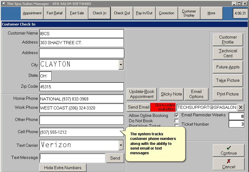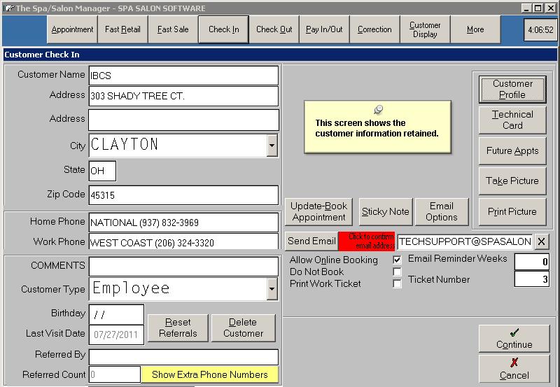 Check InCustomer Check In is accessed from the top of the Main Menu or by clicking on the client's name in the appointment book. The Check In screen allows you to enter the client's information with address information along with referral information. The system automatically completes the city name, state and zip code if they are entered into the maintenance section of the program. Customer Names - How do I enter them? Customer names are entered using last name followed by first name, the first and last name should be separated by either a space or a comma, but not both.
