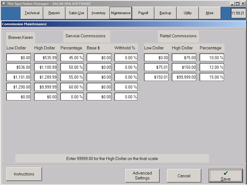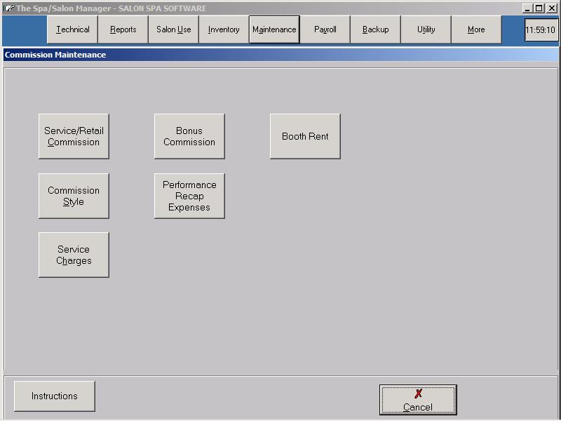 Commission SetupCommission Setup is accomplished by clicking More until you see the Maintenance choice. Click Commission followed by Click Service/Retail Commission and select the employee to setup.