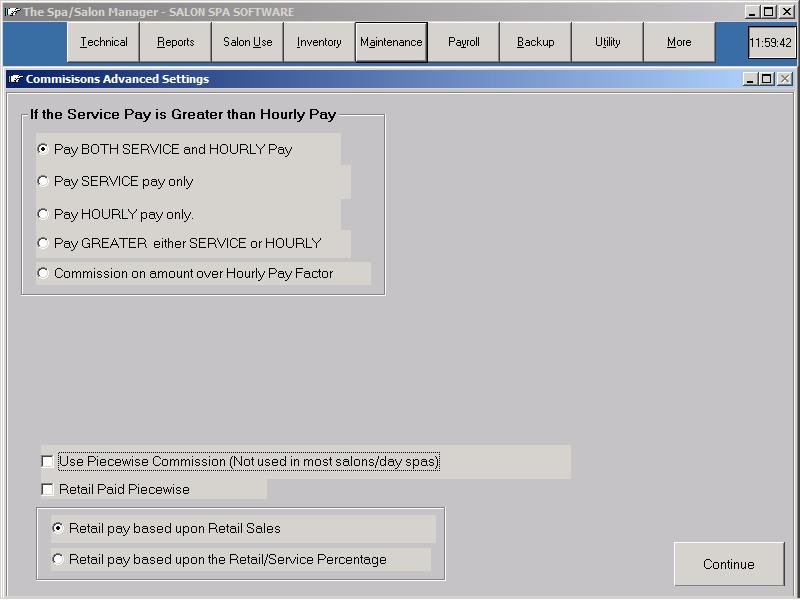 PiecewiseNow, let's assume the employee is paid Piecewise with the same service and retail sales as above. The calculation would involve two steps. First the employee would receive 40% of the first $1000.00 or $400.00 and 50% of the balance over which is 50% of $200 or $100. Total service commission is $500.00 instead of $600.00 in the previous example. The retail calculation is the same as above 10% of $150.00 or $15.00. As you can see from the example piecewise commission benefits the employer not the employee. The total pay for piecewise is $515.00 versus $615.00 which is $100.00 change. Note: If the employee receives a flat rate for all services, only the first line needs to be completed with 0.00 in the low and 99999.00 in the high and the rate on the last line. AdvancedThe Advanced button allows the Commission to be calculated between multiple pay types. For example, you can pay employees based upon the greater amount of either Service, Hourly or Salary. Piecewise commission is selected from the Advanced button.