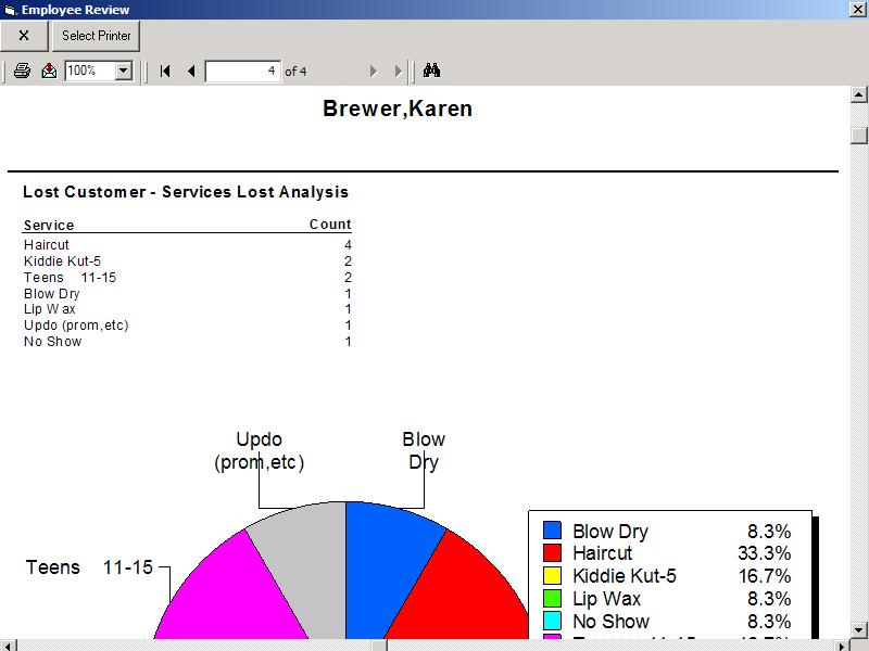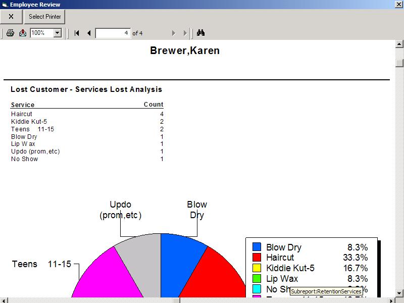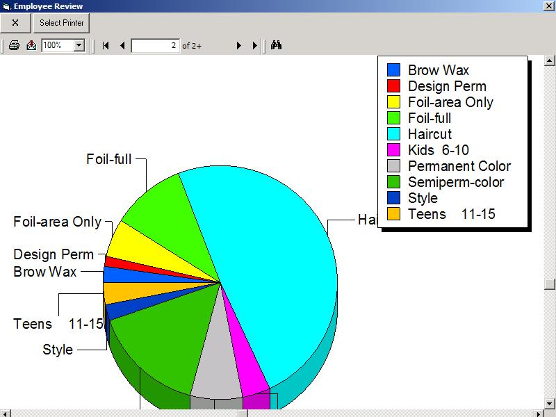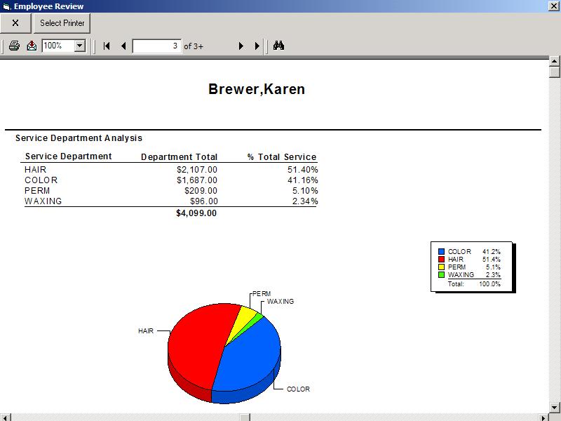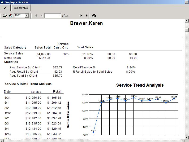 Important statistics such as Average Service $ / Client, Average Retail $ / Client, Retail / Service % and Percent of Retail to Total Sales are shown in the reports. The report shows the trends based upon weekly, monthly, quarterly, bi-annual or yearly. The trend graph shows growth or decline in sales. It is recommended to look at the quarterly trends to show true trends. Bi-annual and annual allow for a long history. Services are broken down by dollar amount showing the percentage of total service sales and sales by department. A sample report is shown below. |