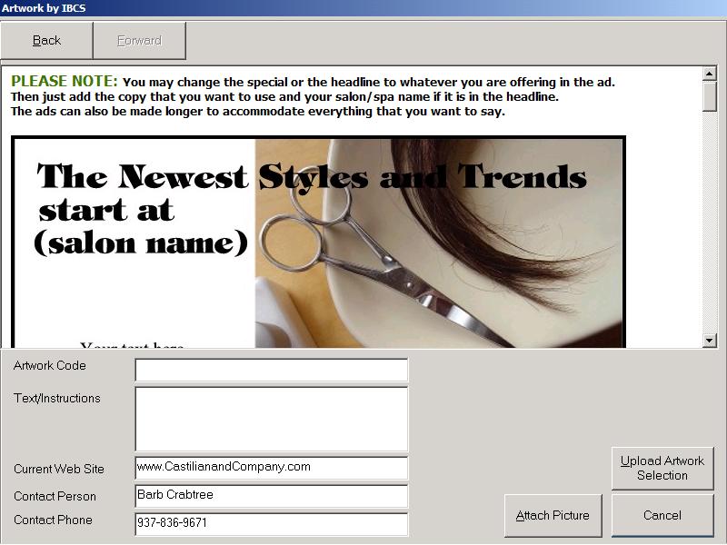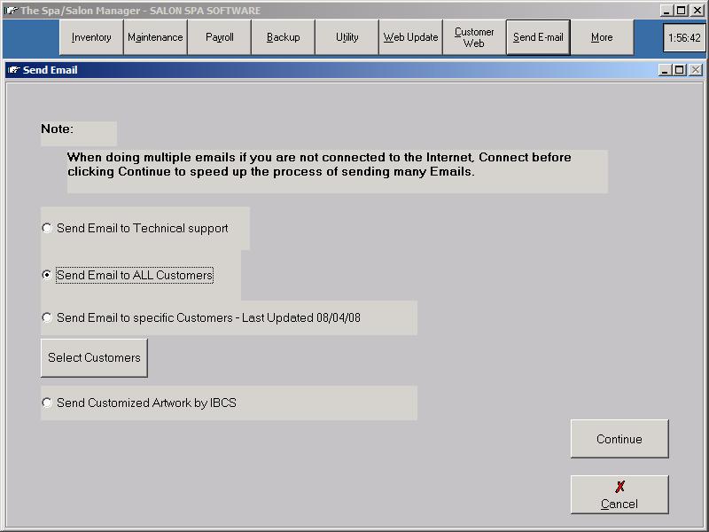 Marketing - Automatic Emails The Spa/Salon Manager program has many automatic emails that it can send out to your customers. When setting up a new email account in the system under Maintenance -> Internet / Marketing you can set up which types of emails you would like the program to automatically send each night. Birthday emails, confirmation emails, reminder emails, and thank you emails to new customers can all be set up within this section. Marketing - Manual Emails Customers can be emailed using the Mailing section under Reports. Click the checkbox that says, Email Only, the system creates a list of customers based upon the mailing criteria you have chosen. Whether you want to email to all of the new customers that came in last month or to the customers that did not return, it's up to you. When you have a big announcement about the salon or want to offer a special promotion, the system allows you to email all of your customers in a few minutes. Marketing - Text Messaging In addition to using customer email addresses to stay in touch you can also contact customers by sending text messages directly to their cell phones. Text messages can be sent directly to specific customers and the program will automatically send out text messages to all customers due in each day to remind them about their appointments. Checking SpaSalon EmailOnce you've sent emails out to customers you'll want to get their responses. You can read any replies sent to your SpaSalon email account by going to Send E-mail -> Check SpaSalon Email. On that screen you'll see a list of your most recent emails which you can sort by the date, sender, or subject. When you click on an email you'll be able to see the sender, subject, and date, read the email, and you'll have options to Reply and Delete the message. In addition, if there are attached files you can save them to the pictures folder in our program. Finally, if the sender's email address is in your program you can click Customer Display to access the customer's information. Artwork by IBCSDon't have time to stay in touch with your customers? Want to add that professional touch to your emails? Let us do it for you using Artwork by IBCS.