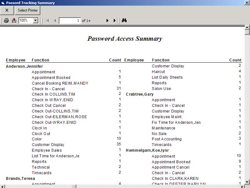 Standard Password Tracking Report Their are many possible uses for this report, but two examples should explain the importance. Example 1: If you have an employee who forgets to Clock In and who tells you that they arrive at 8:00 AM each morning and then get so busy in the morning with booking appointments they can't seem to remember to Clock In. This report will show the first time an appointment is booked. You can see if they are booking their first appointment at 8:30 instead of 8:00 AM. Example 2: An employee has repeated trouble balancing the drawer each night. You ask the employee if they checked the drawer when starting their day, (Of course, they have checked it.) Using the Password Tracking report you can see at what times of the day the Register Amounts were checked and whether the Verify Monies was ever performed. Summary Password Tracking The summary report shows how many times they accessed each function without the date and time information. This report is much shorter and it allows you to see what functions have been accessed without all the details of what time and what computer they were using. This report can be useful to check to see if someone is accessing your mailing list without your permission or to check how many times a particular employee is using the computer. |