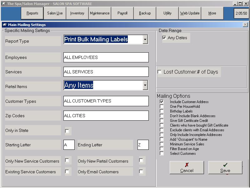 The Mailing Reports allow for many types of reports to be printed, but one of the most frequently used is for Thank You's. To print Thank You's for all new service customers, select the desired parameters, and select new service customers only. You can select new customers that had a specific service or all customers depending on your desired mailing selections.
